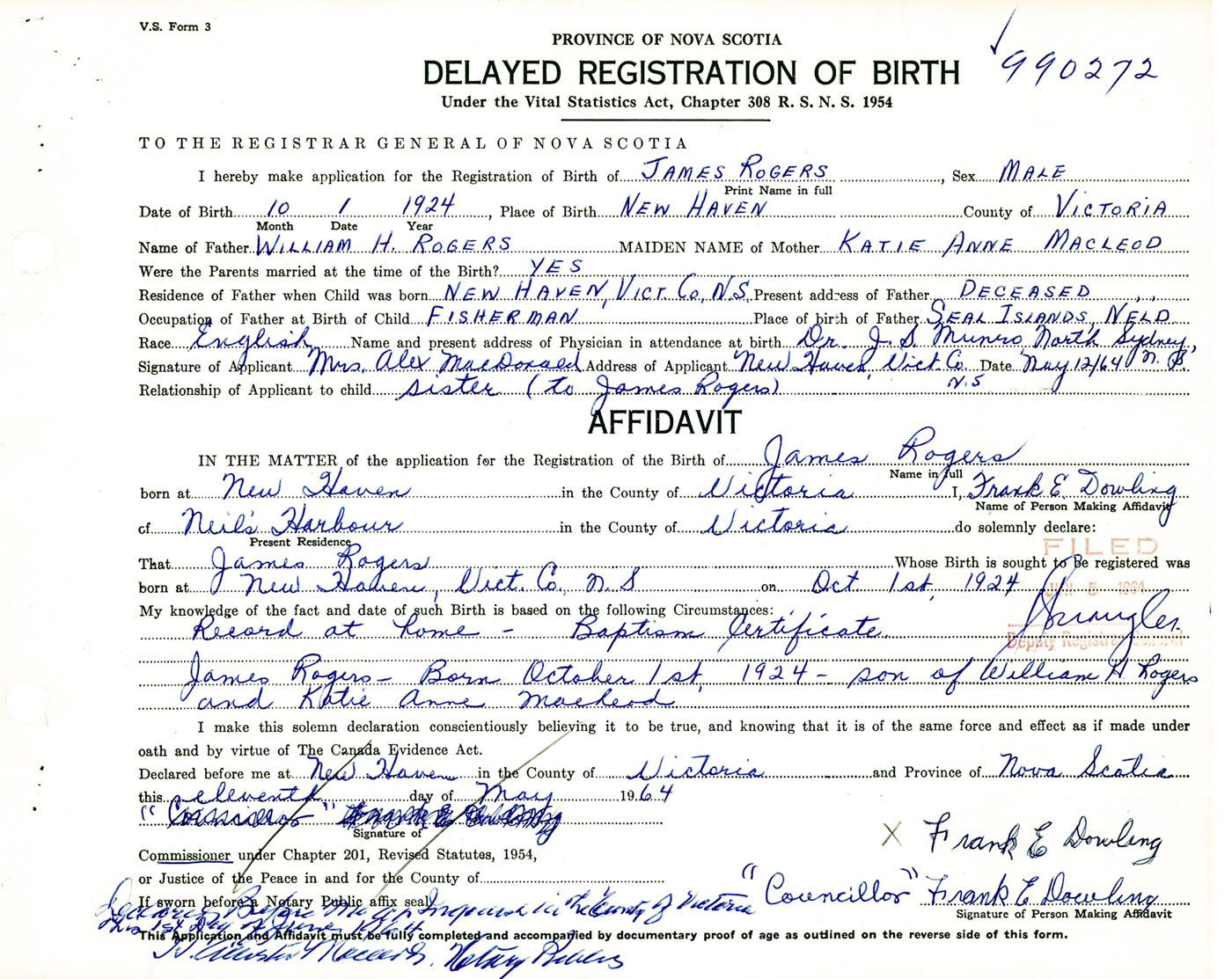 Signature of Applicant Mrs. Alex MacDonald Address of Applicant New Haven, Victoria Co., NS Date 12 May 1964