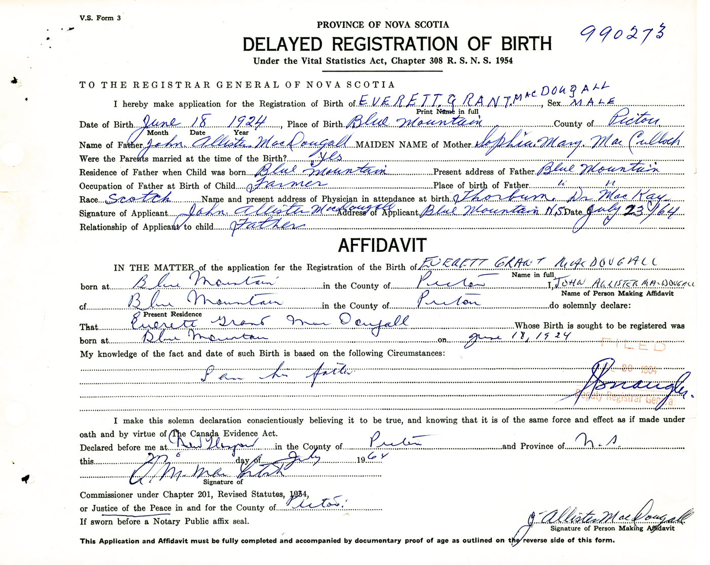 Signature of Applicant John Allister MacDougall Address of Applicant Blue Mountain, Pictou Co., NS Date 23 July 1964