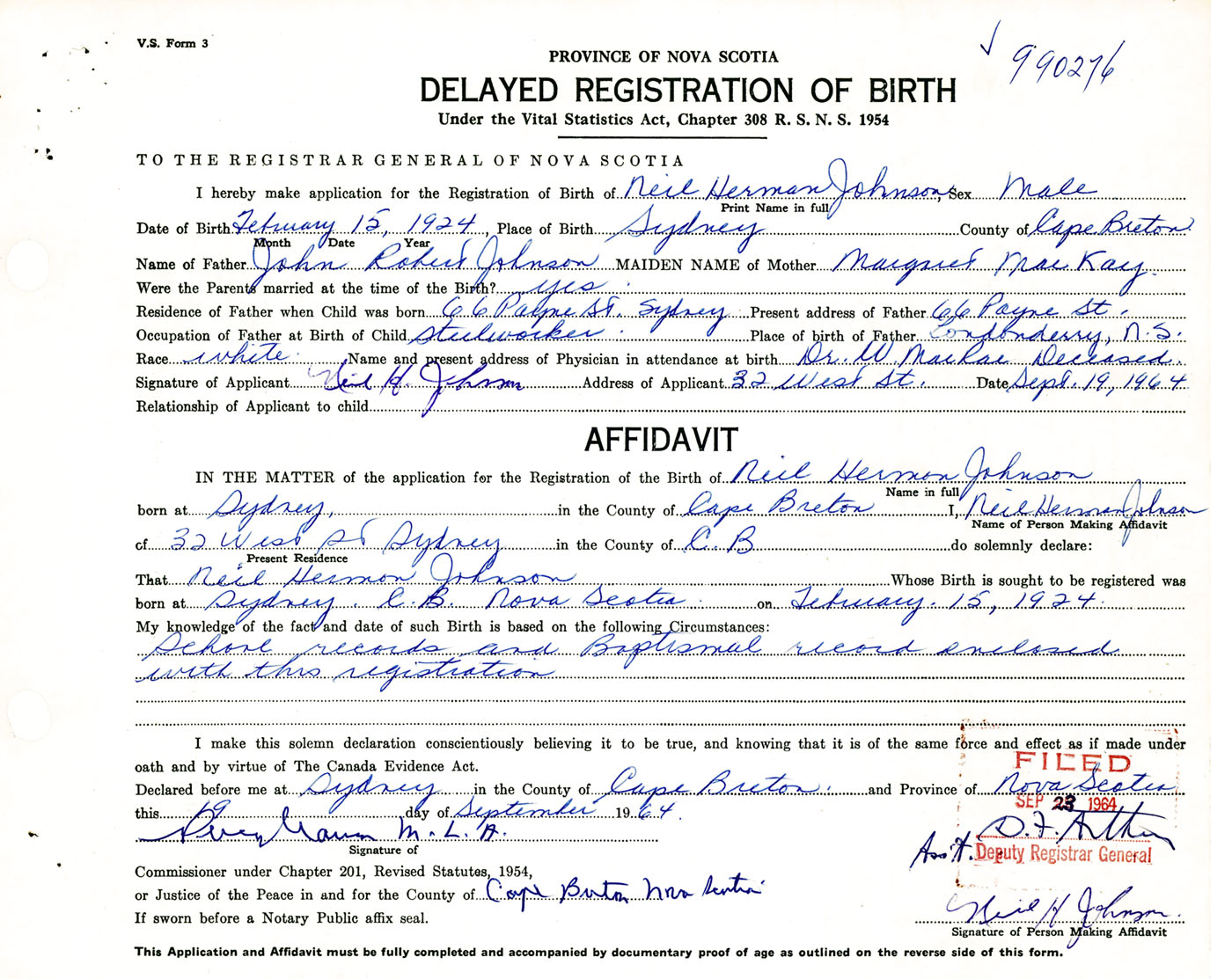 Signature of Applicant Neil H. Hohnson Address of Applicant 32 West Street, Sydney, Cape Breton Co., NS Date 19 September 1964