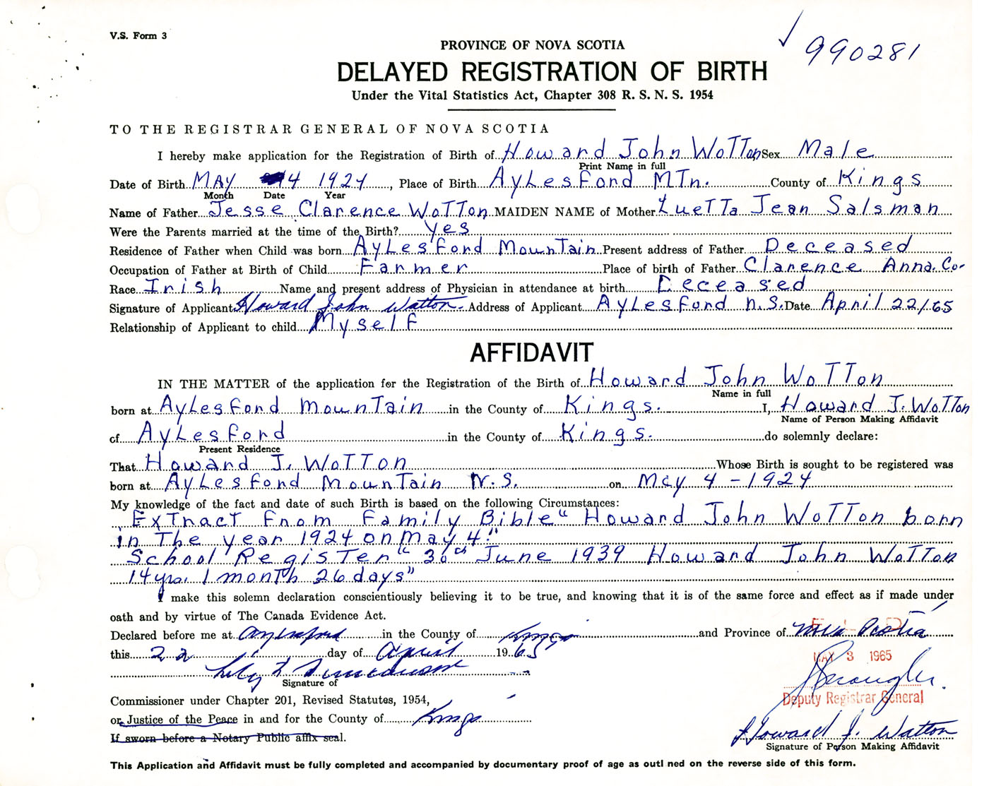 Signature of Applicant Howard John Wotton Address of Applicant Aylesford Mountain, Kings Co., NS Date 22 April 1965