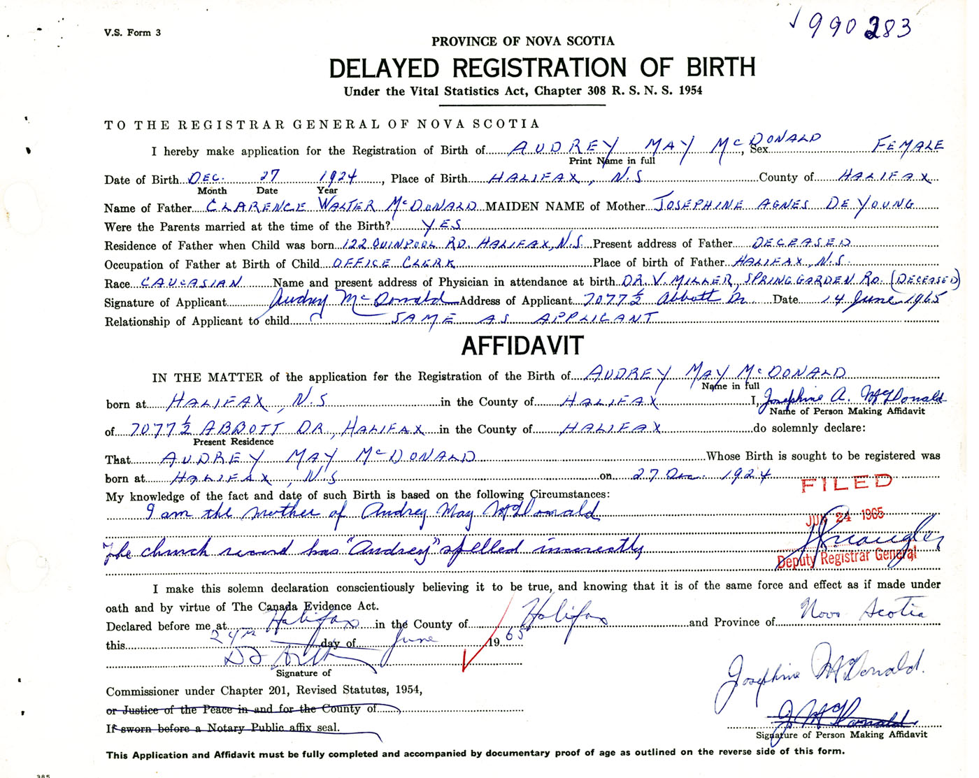 I hereby make application for the Registration of Birth of Audrey MayMcDonald Sex Female