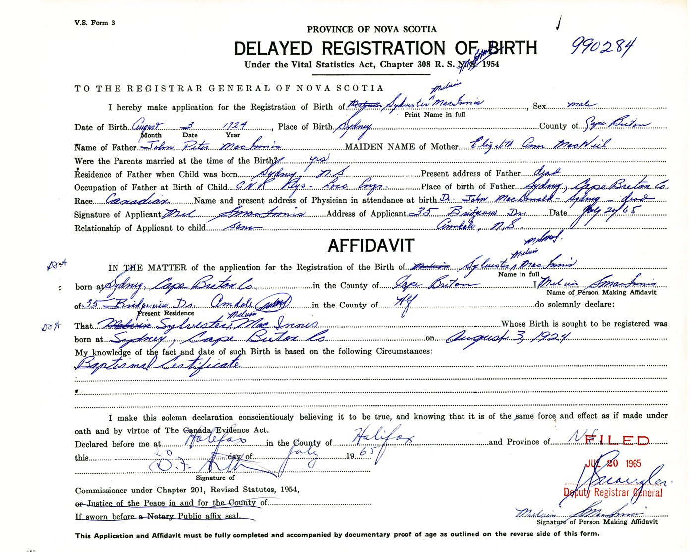 IN THE MATTER of the application for the Registration of the Birth of Sylvester MelvinMacInnis