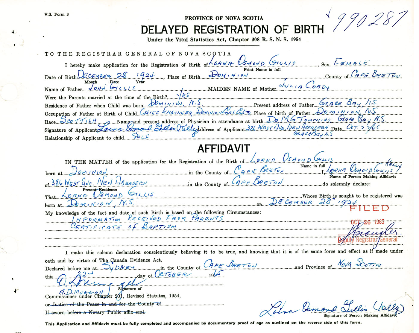 Signature of Applicant Lorna Osmond Gillis (Kelly) Address of Applicant 386 West Avenue, New Aberdeen, Glace Bay, Cape Breton Co., NS Date 22 October 1965