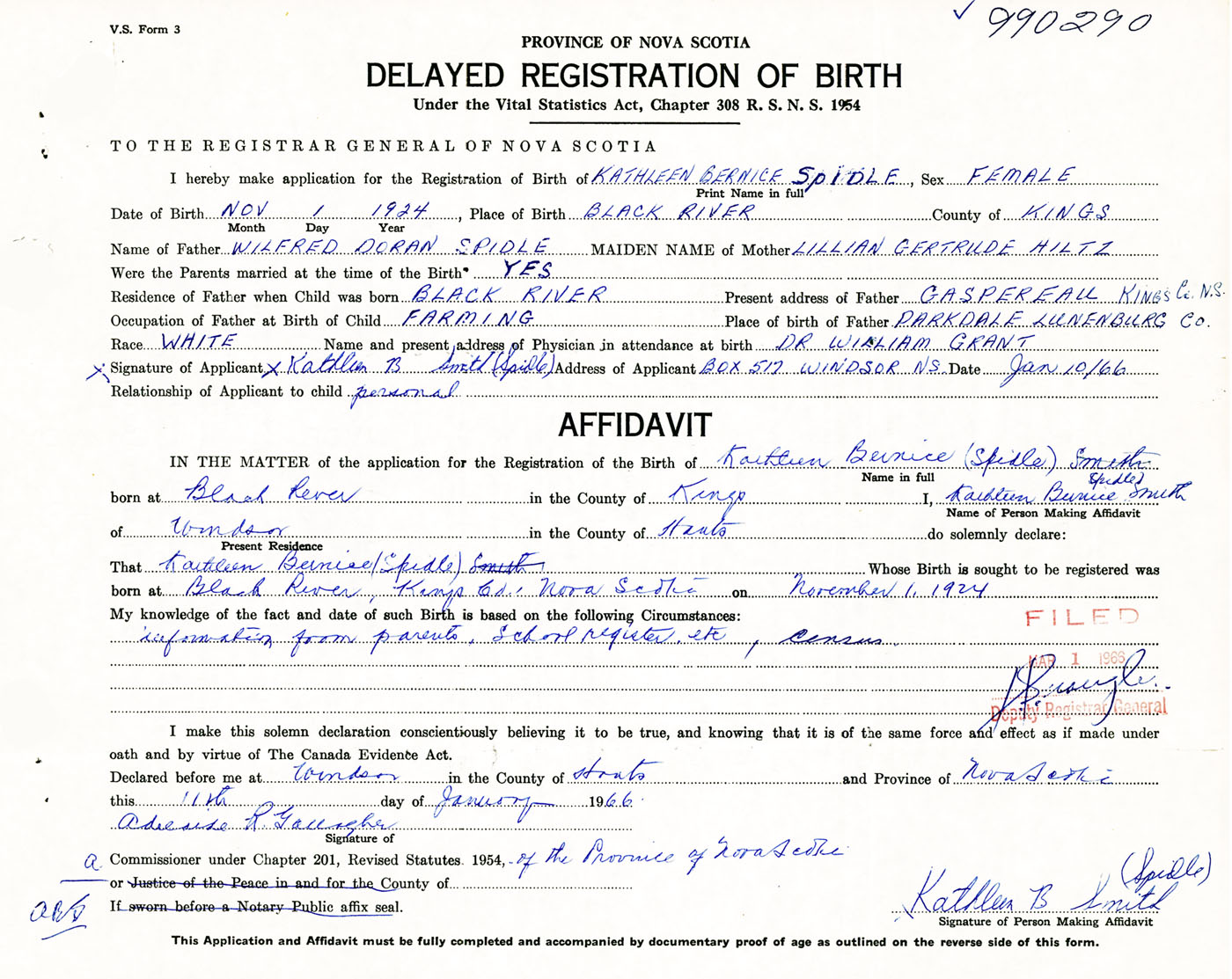 Signature of Applicant Kathleen B. Smith (Spidle) Address of Applicant Box 517 Windsor, Hants Co., NS Date 10 January 1966