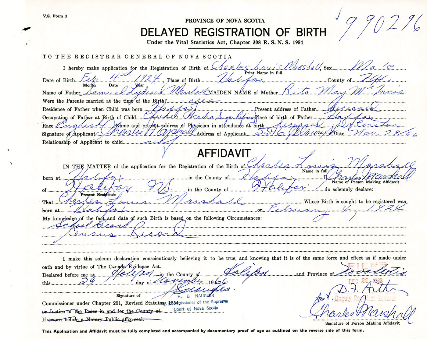 Signature of Applicant Charles Marshall Address of Applicant 5546 Almon Street, Halifax, NS Date 29 November 1966