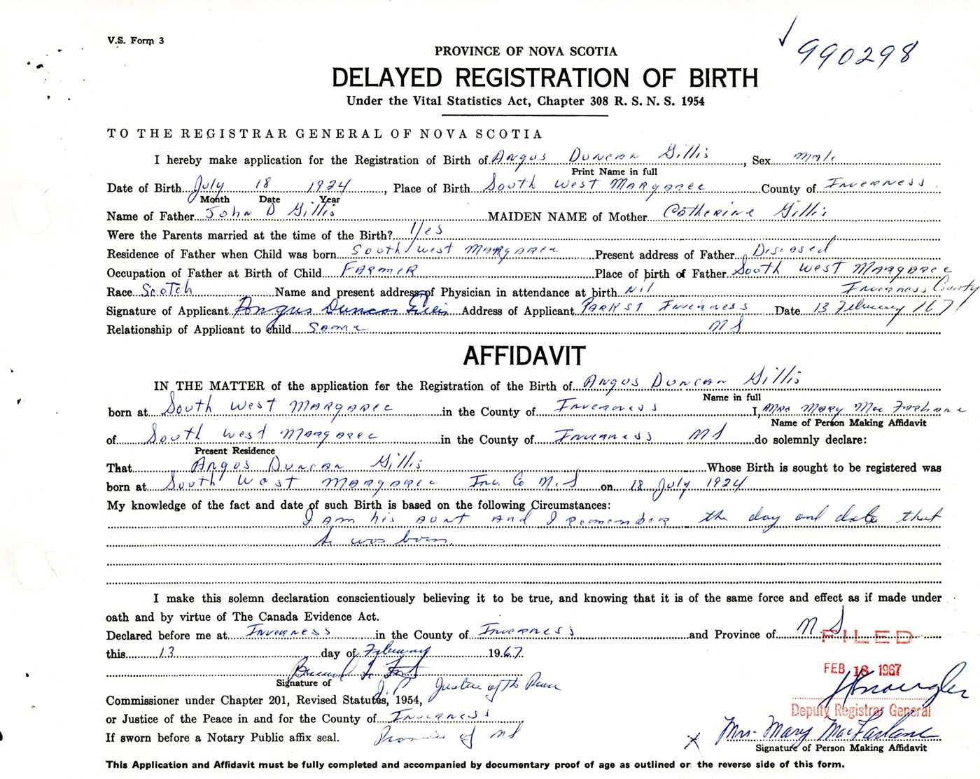 Date of Birth July 18, 1924 Place of Birth South West MargareeCounty of Inverness