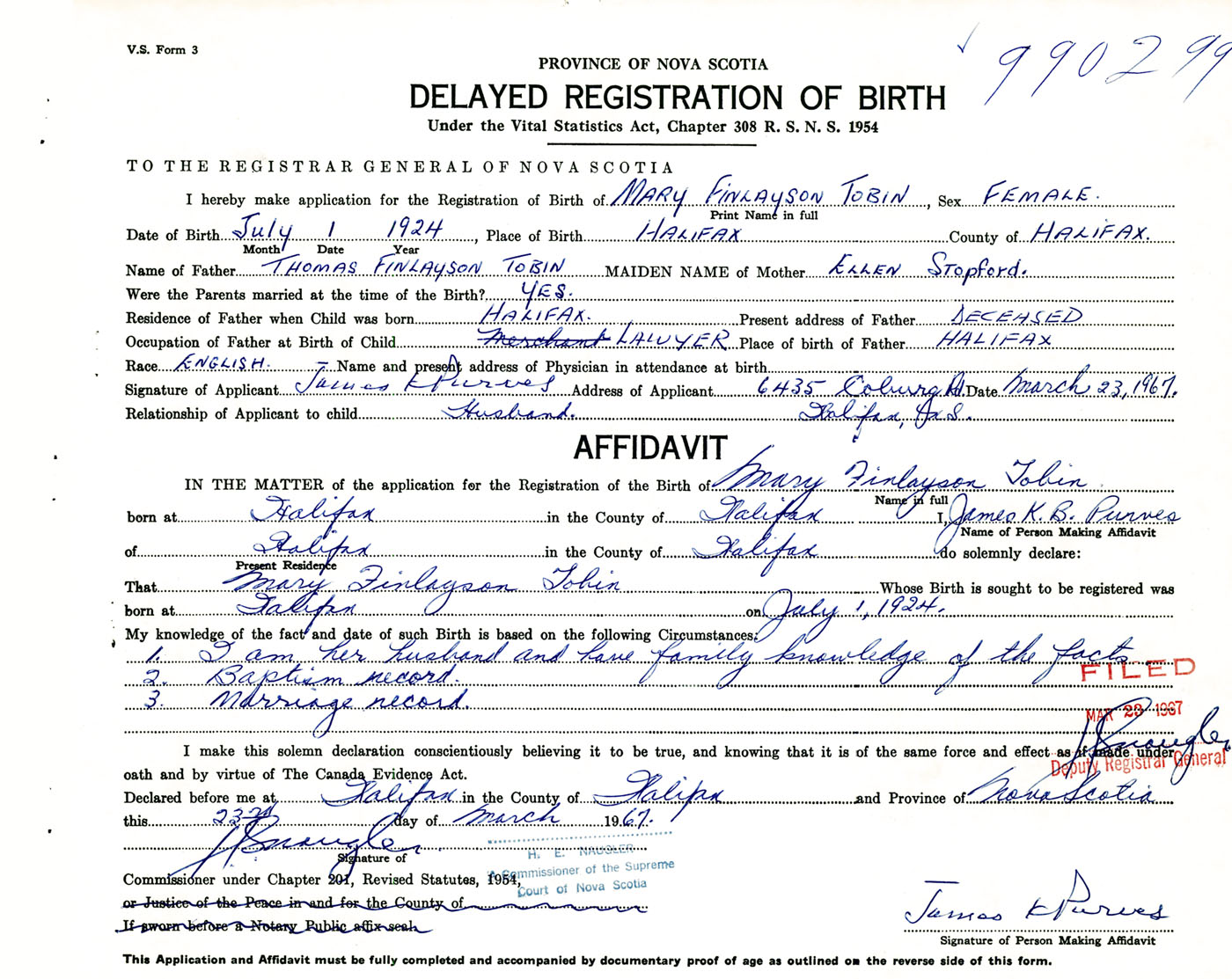 I hereby make application for the Registration of Birth of Mary FinlaysonTobin Sex Female