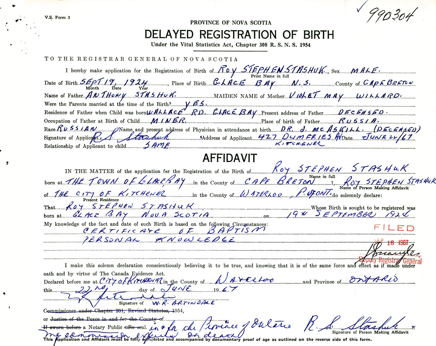 I hereby make application for the Registration of Birth of Roy StephenStashuk Sex Male