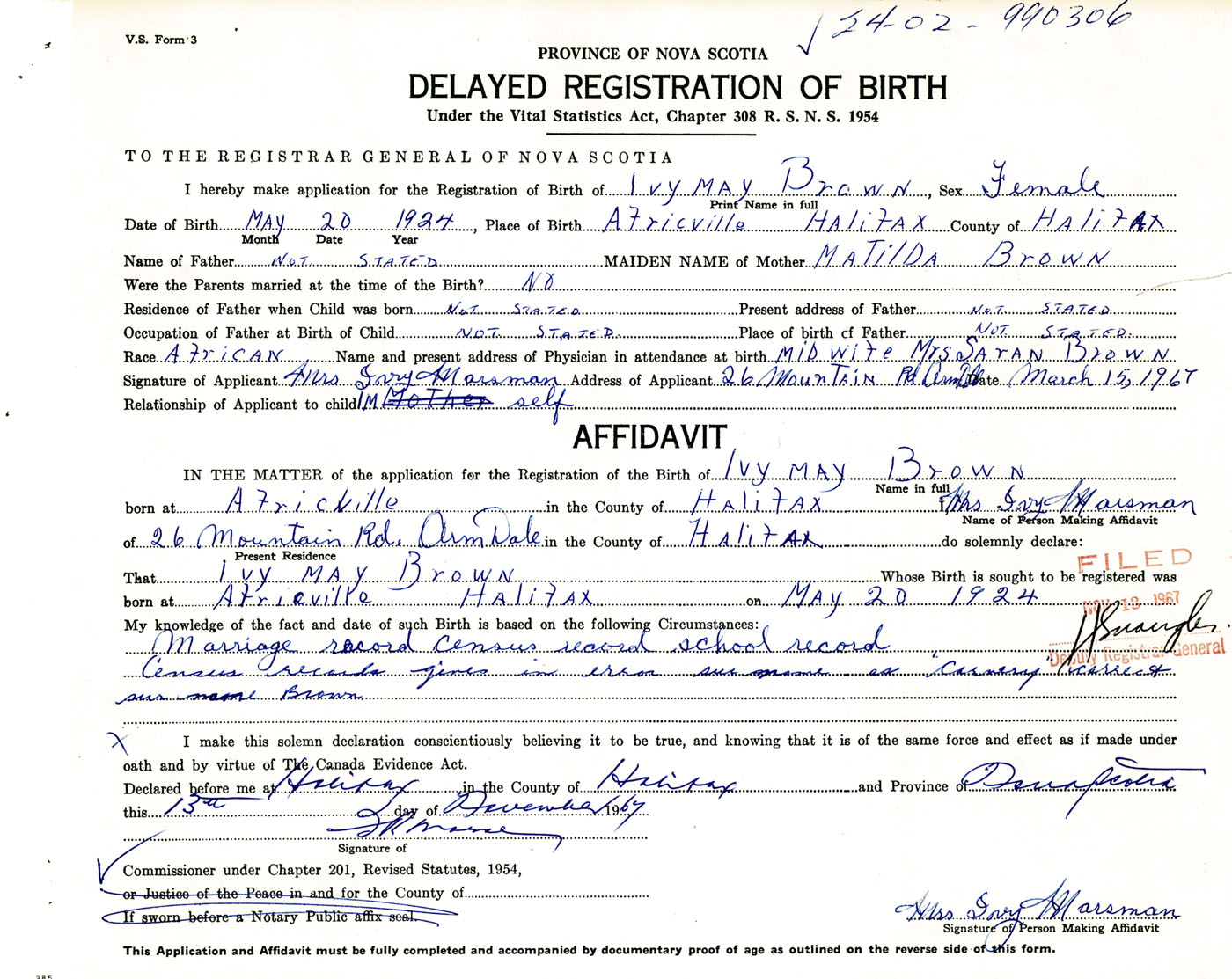 Signature of Applicant Mrs. Ivy Marsman Address of Applicant 26 Mountain Road, Armdale, Halifax Co., NS Date 15 March 1967