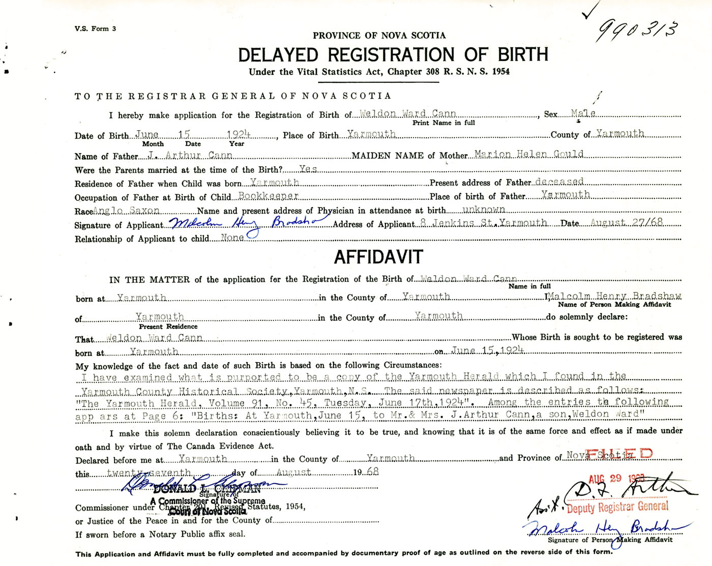 I have examined what is purported to be a copy of the Yarmouth Herald which I found in the Yarmouth County Historical Society, Yarmouth, NS. The said newspaper is described as follows: "The Yarmouth Herald, Volume 91, No. 45, Tuesday, June 17th, 1924". Among the entries, the following appears at page 6: "Births: At Yarmouth, June 15, to Mr. & Mrs. J. Arthur Cann, a son, Weldon Ward"