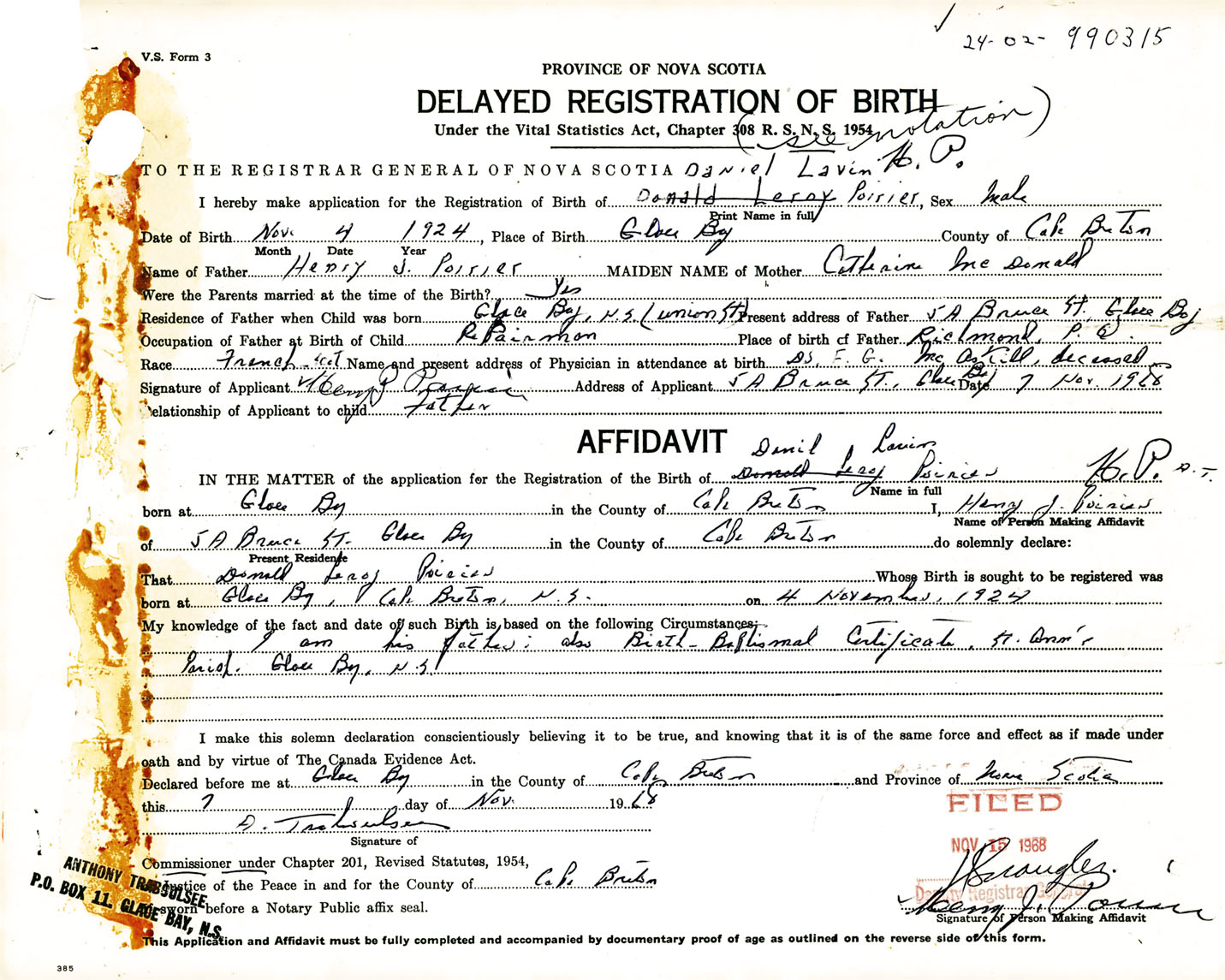 Signature of Applicant Henry Poirier Address of Applicant 5A Bruce Street, Glace Bay, Cape Breton Co., NS Date 7 November 1968
