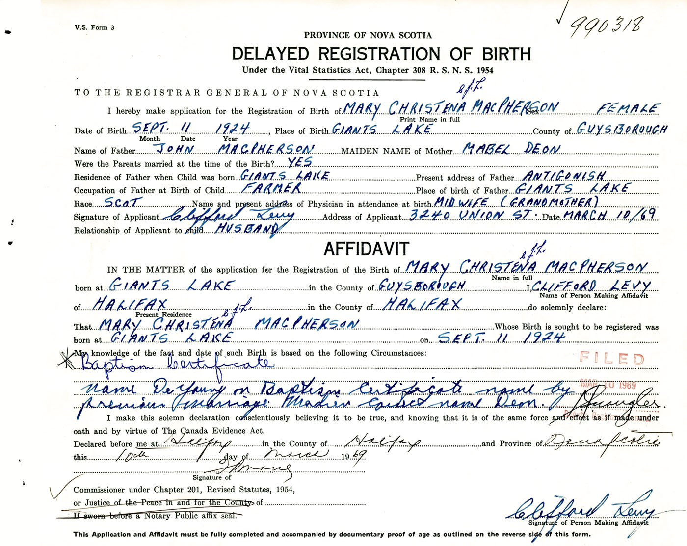 Signature of Applicant Clifford Levy Address of Applicant 3240 Union Street, Giant Lake, Guysborough Co., NS Date 10 March 1969