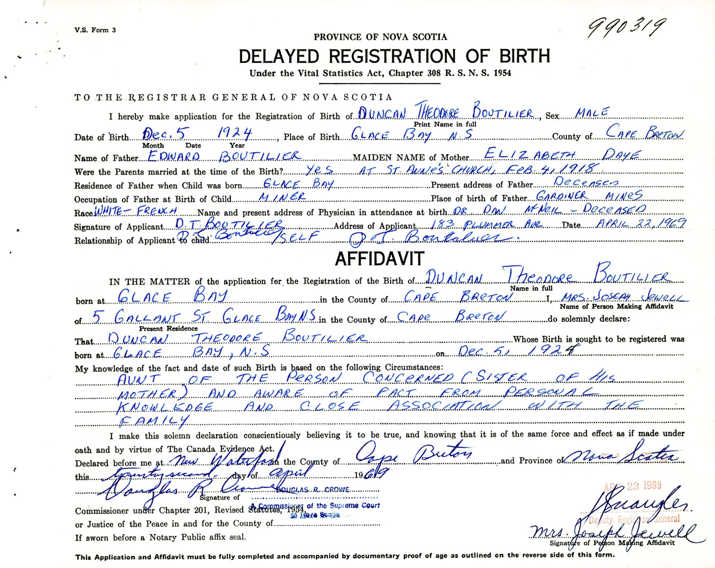 Signature of Applicant D. T. Boutilier Address of Applicant 183 Plummer Avenue, New Waterford, Cape Breton Co., NS Date 22 April 1969