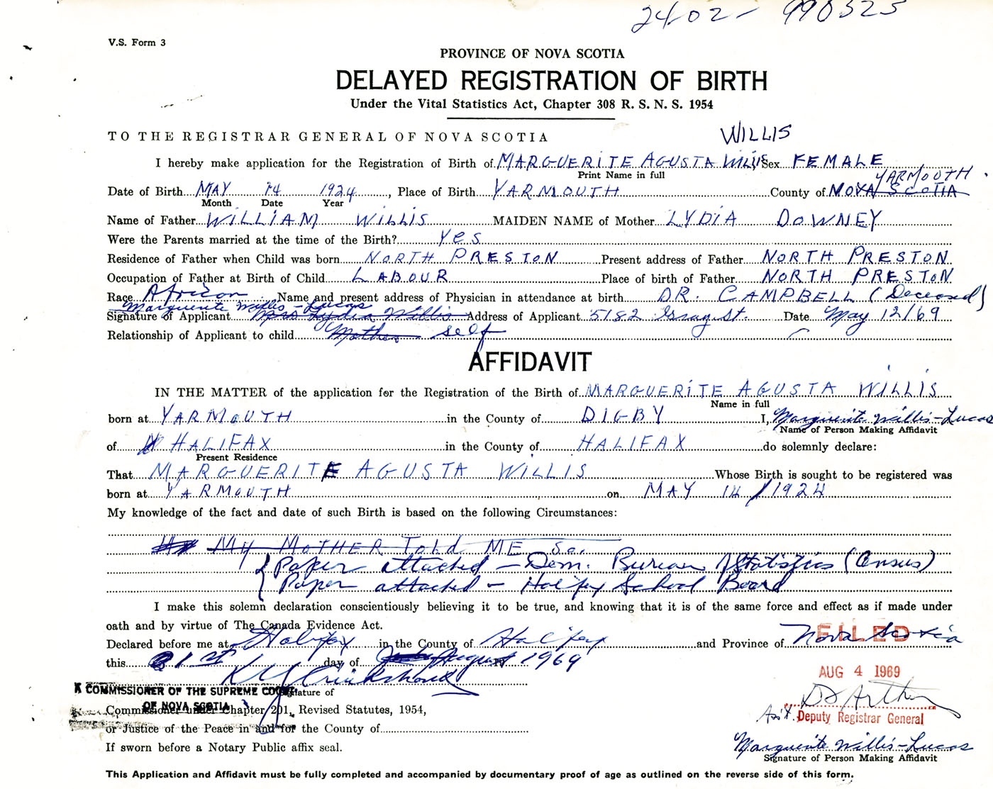 Signature of Applicant Marguerite Willis-Lucas Address of Applicant 5182 Gray Street, Halifax, NS Date 12 May 1969