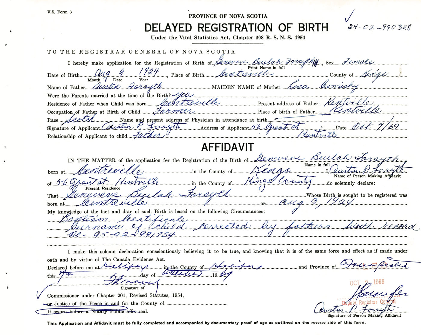 Signature of Applicant Austin P. Forsyth Address of Applicant 56 Grant Street, Kentville, Kings Co., NS Date 7 October 1969
