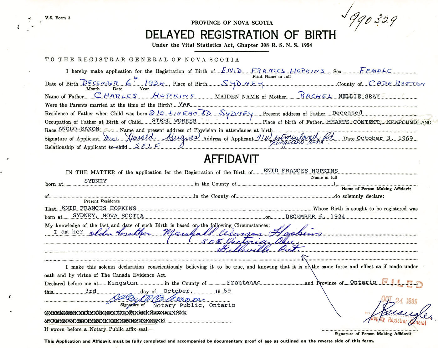 I hereby make application for the Registration of Birth of Enid FrancesHopkins Sex Female