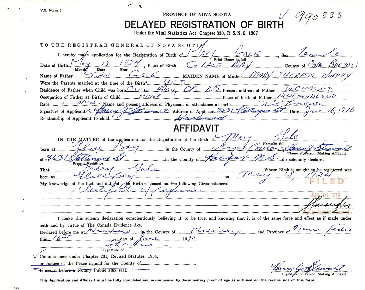 I hereby make application for the Registration of Birth of MaryGale Sex Female