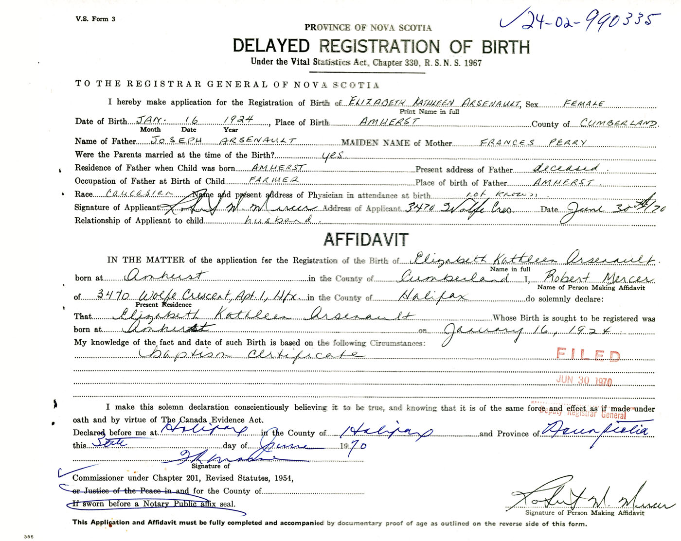 Signature of Applicant Robert M. Mercer Address of Applicant 3470 Wolfe Crescent, Halifax, NS Date 30 June 1970