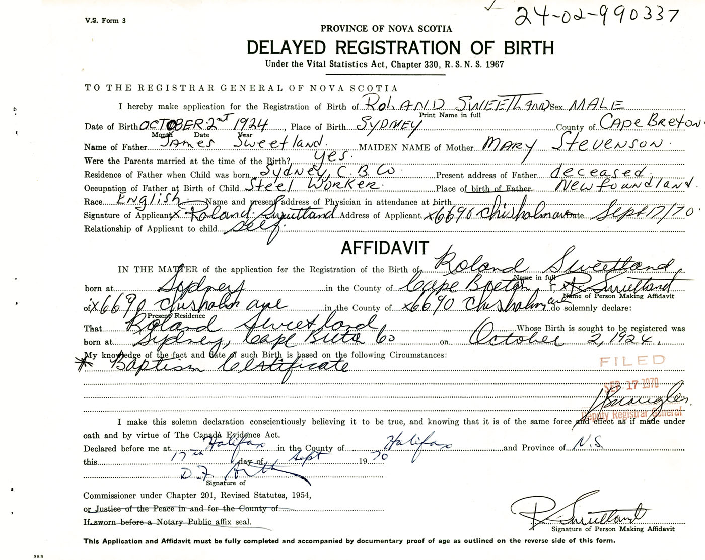 I hereby make application for the Registration of Birth of RolandSweetland Sex Male