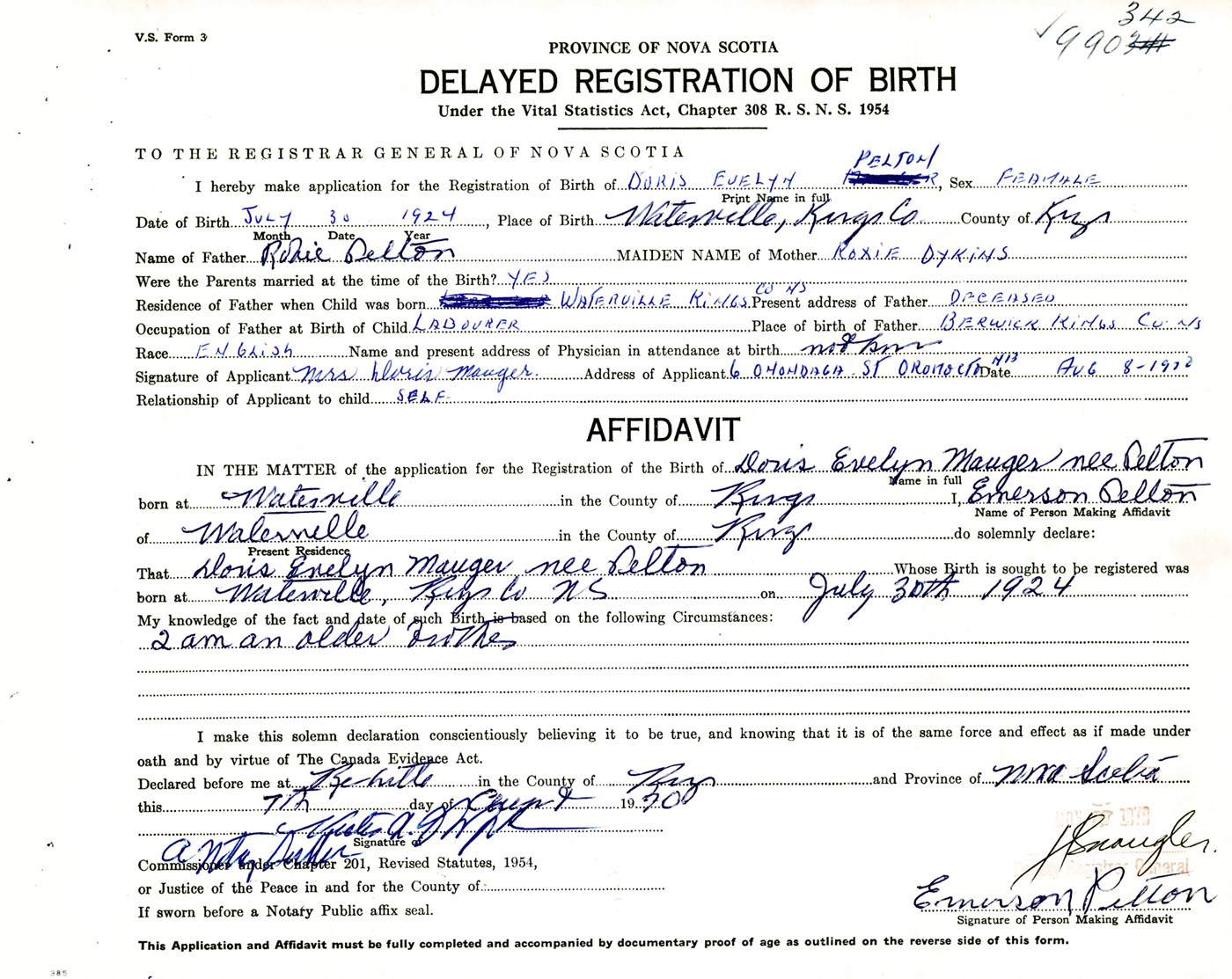 I hereby make application for the Registration of Birth of Doris EvelynPelton Sex Female