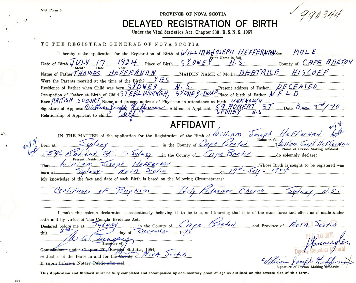 Signature of Applicant William Joseph Heffernan Address of Applicant 59 Robert Street, Sydney, Cape Breton Co., NS Date 3 December 1970