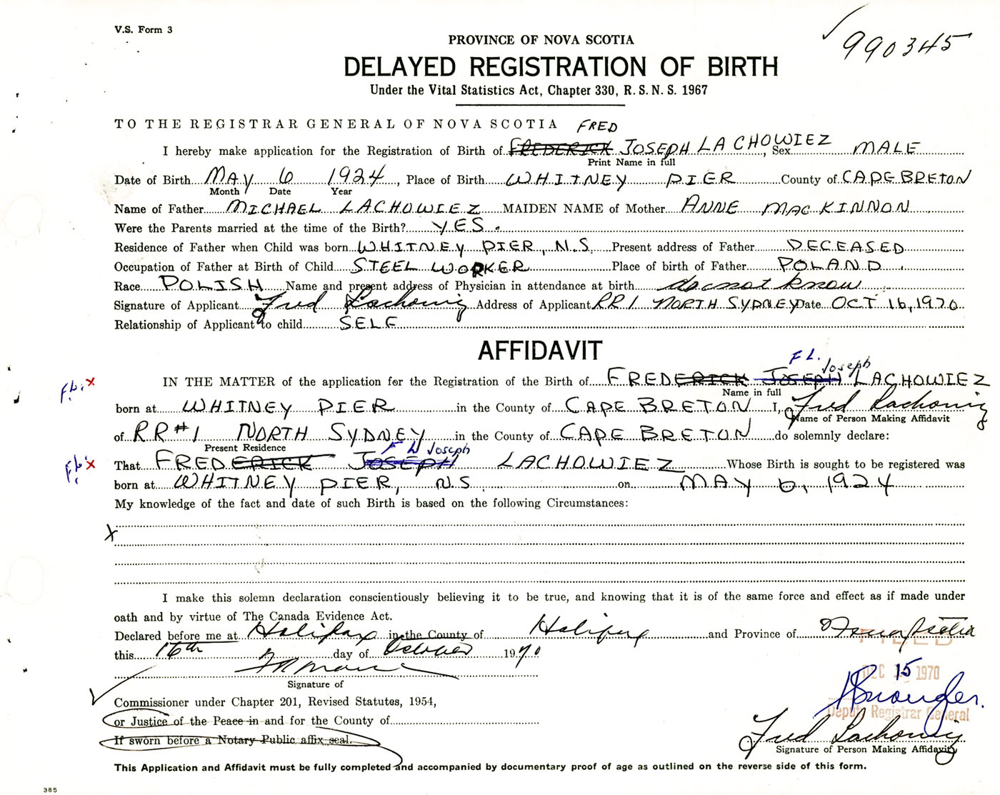 Signature of Applicant Fred Lachowiez Address of Applicant RR #1, North Sydney, Cape Breton Co., NS Date 16 October 1970