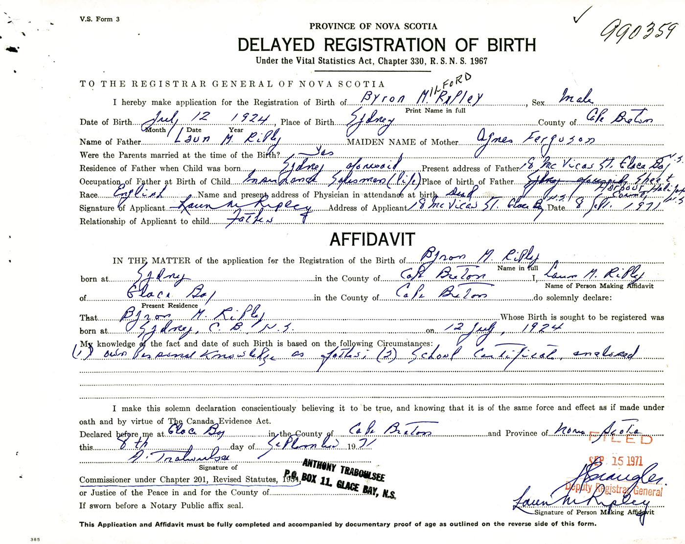 Signature of Applicant Laun M. Ripley Address of Applicant 18 McVicar Street, Glace Bay, Cape Breton Co., NS Date 8 September 1971