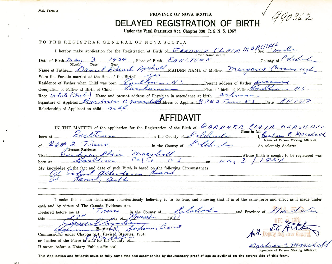 Signature of Applicant Gardner C. Marshall Address of Applicant RR #2, Truro, Colchester Co., NS Date 13 November 1971