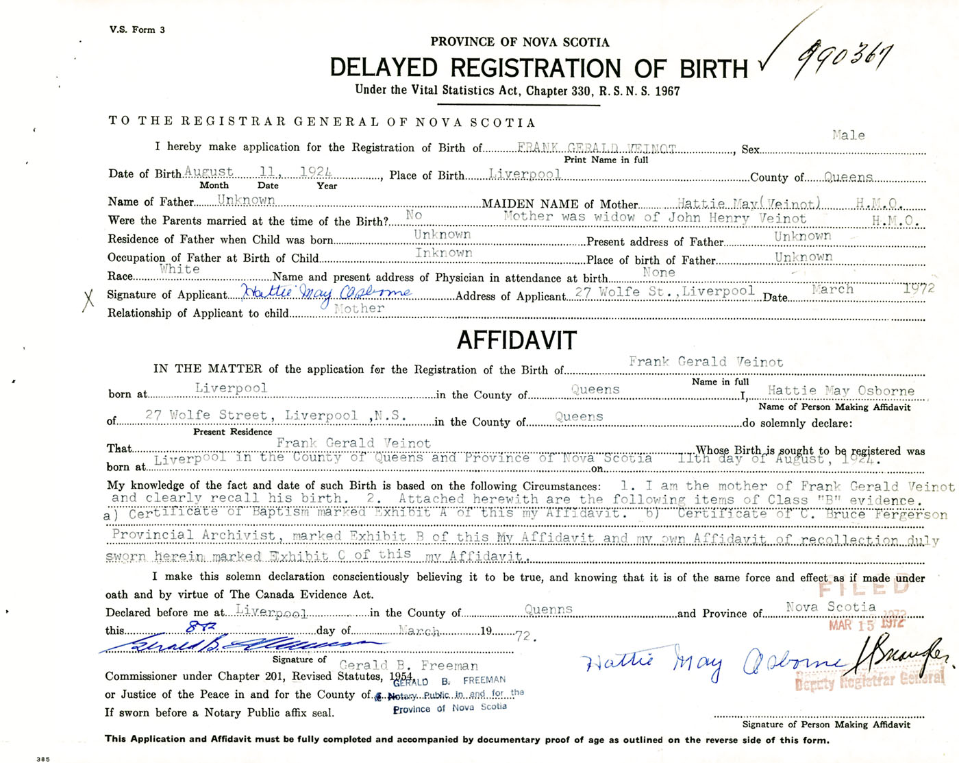 I hereby make application for the Registration of Birth of Frank GeraldVeinot Sex Male