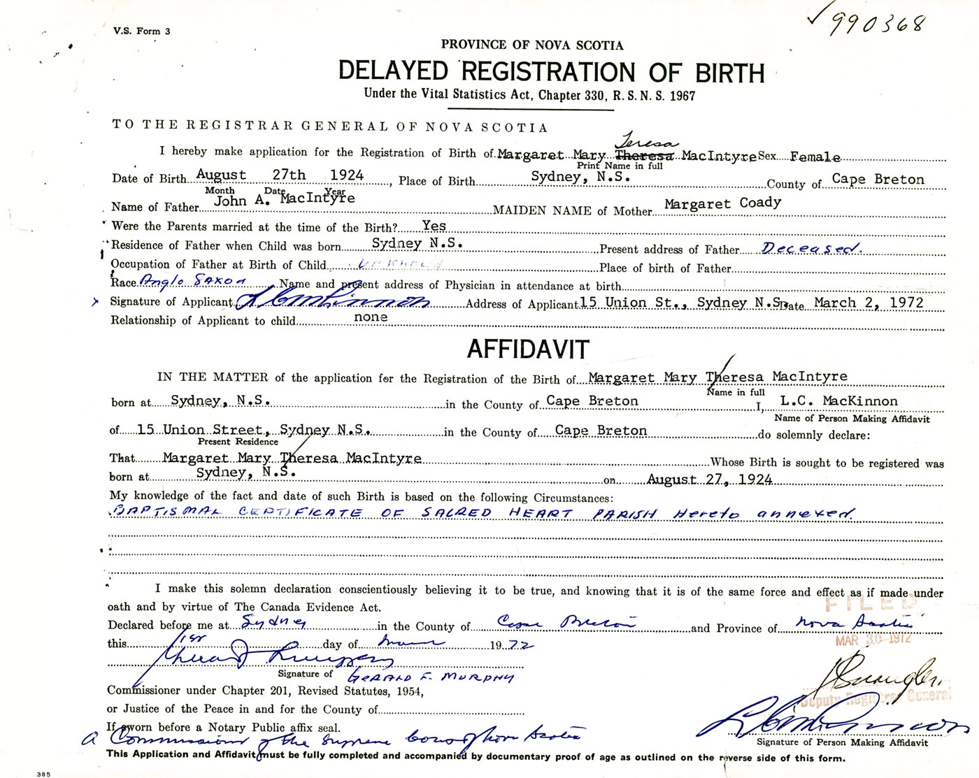 Signature of Applicant L. C. MacKinnon Address of Applicant 15 Union Street, Sydney, Cape Breton Co., NS Date 2 March 1972