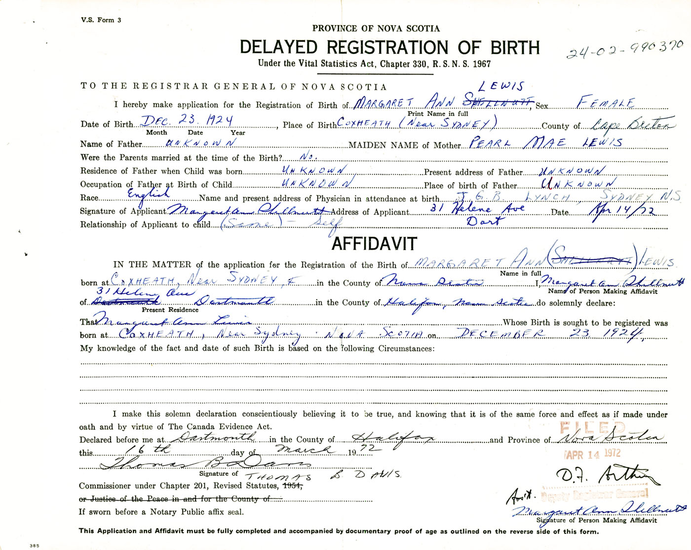 IN THE MATTER of the application for the Registration of the Birth of Margaret AnnLewis