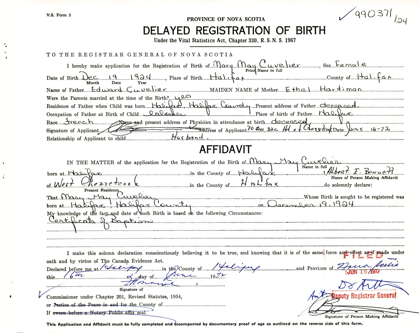 IN THE MATTER of the application for the Registration of the Birth of Mary MayCuvelier