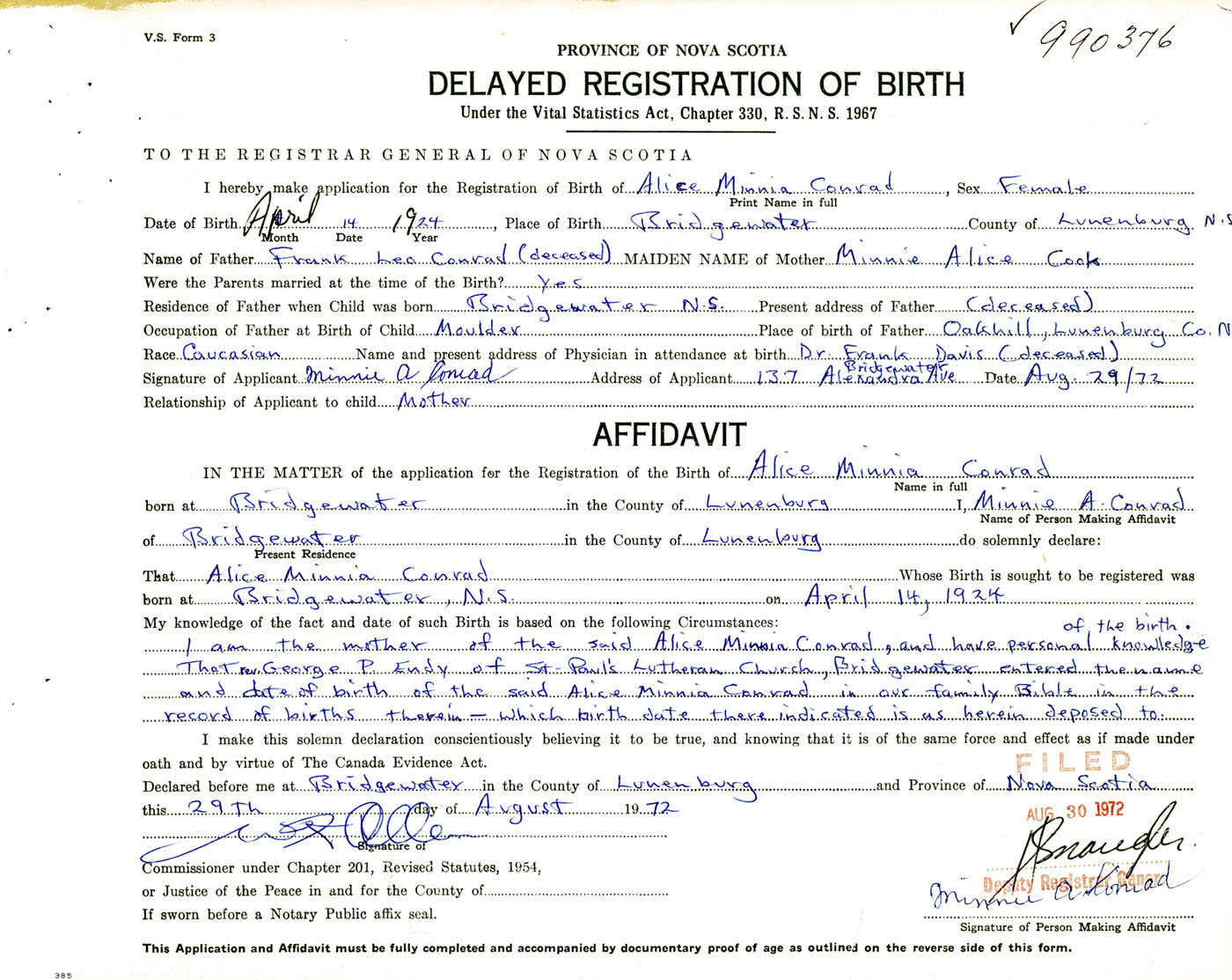 Signature of Applicant Minnie A. Conrad Address of Applicant 137 Alexandra Avenue, Bridgewater, Lunenburg Co., NS Date 29 August 1972