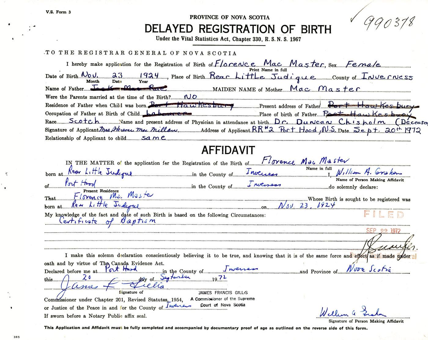 IN THE MATTER of the application for the Registration of the Birth of FlorenceMacMaster