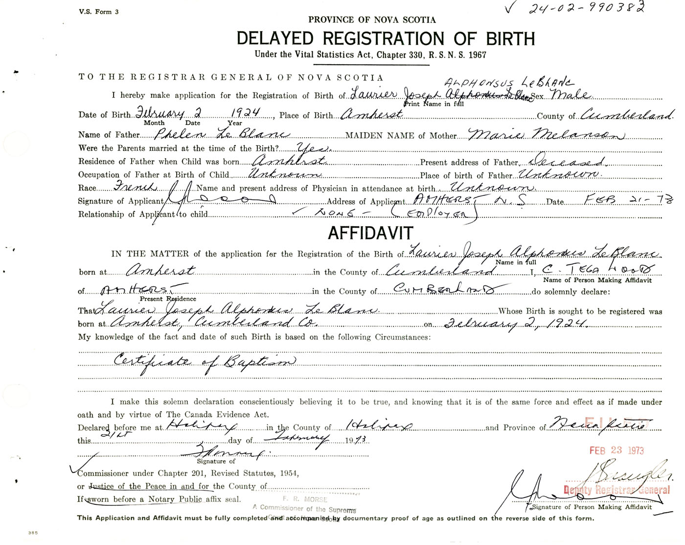 I hereby make application for the Registration of Birth of Laurier Joseph AlphonsusLeBlanc Sex Male