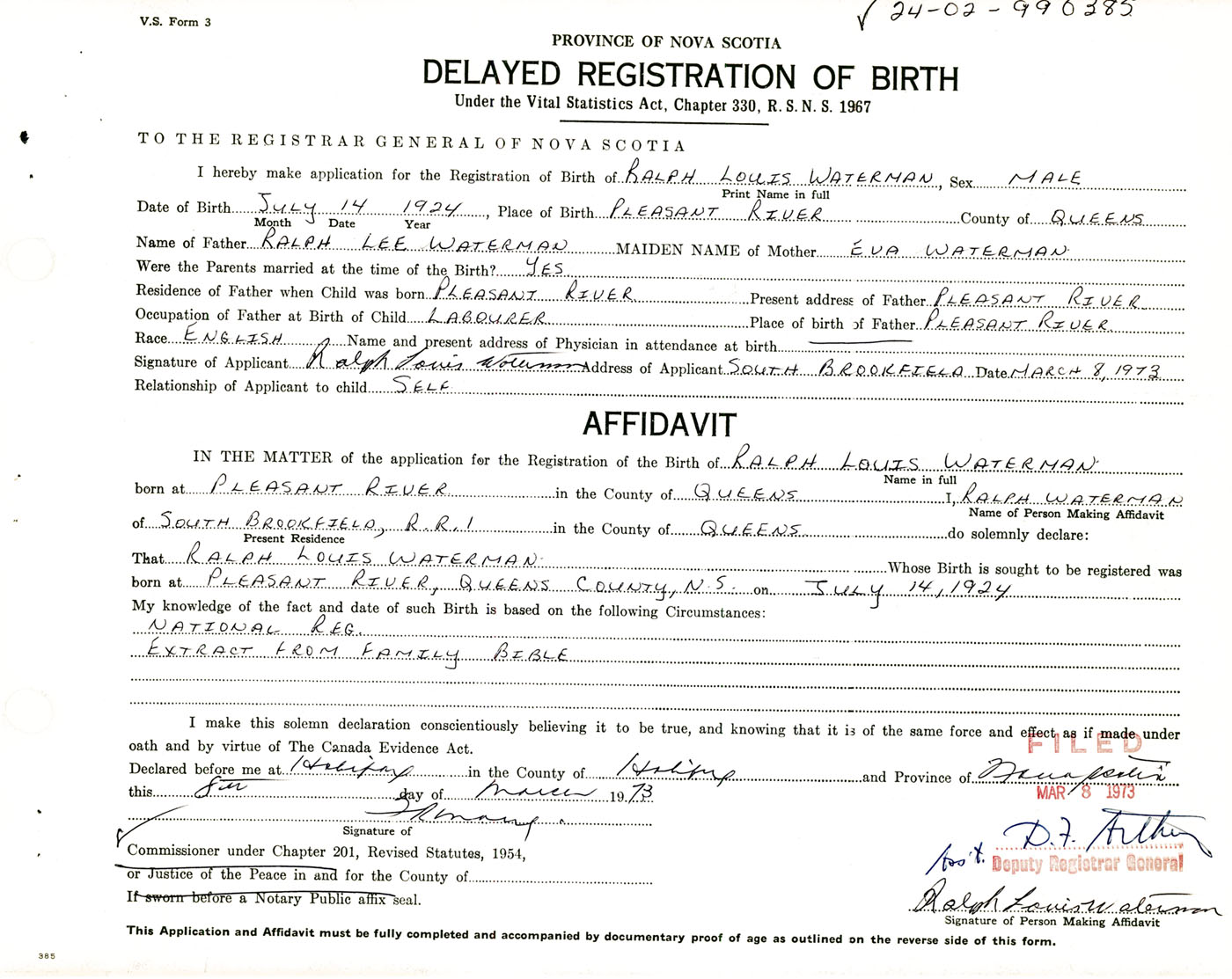 Signature of Applicant Ralph Louis Waterman Address of Applicant South Brookfield, Queens Co., NS Date 8 March 1973