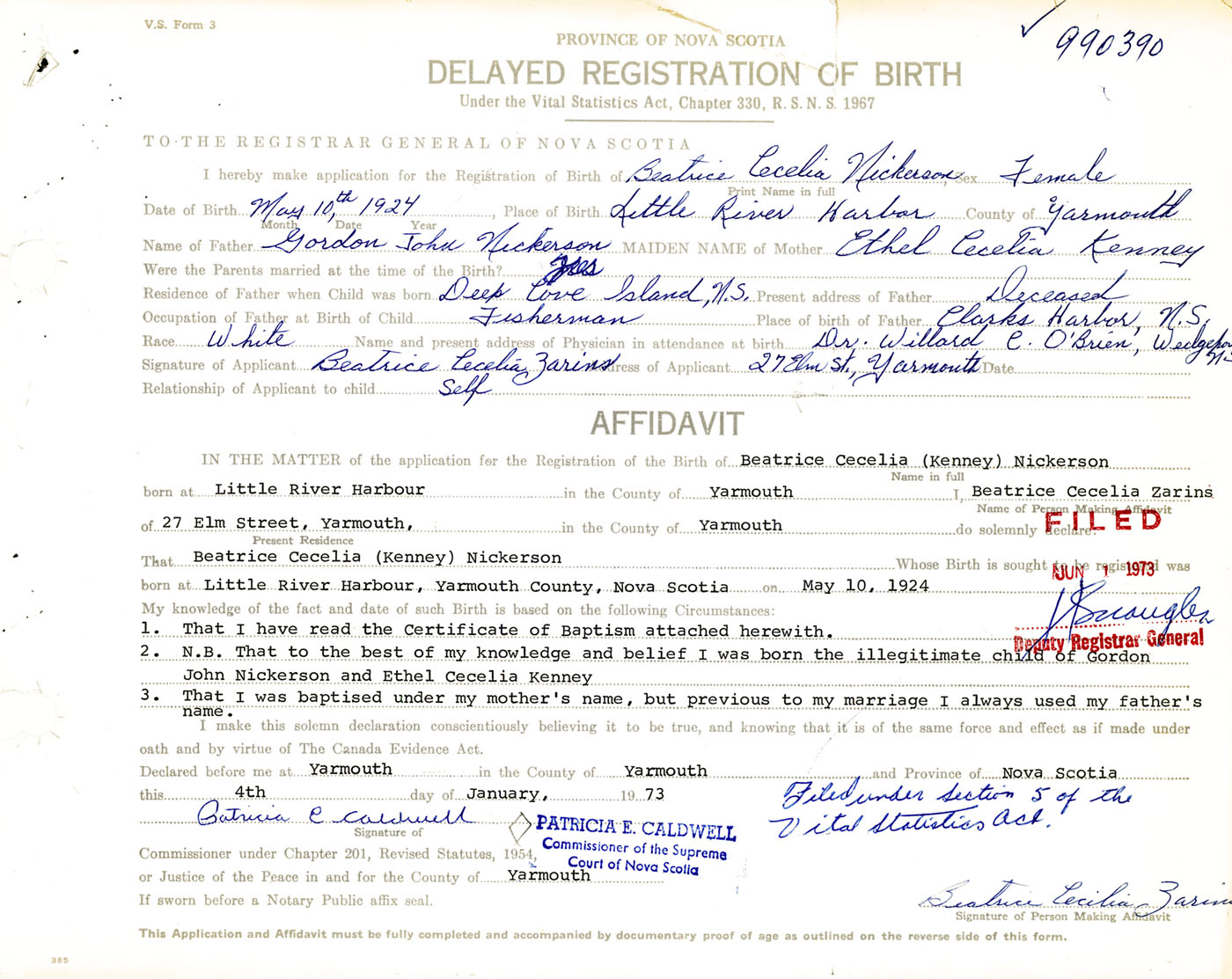 Signature of Applicant Beatrice Cecelia Zarins Address of Applicant 27 Elm Street, Yarmouth, NS Date 4 January 1973