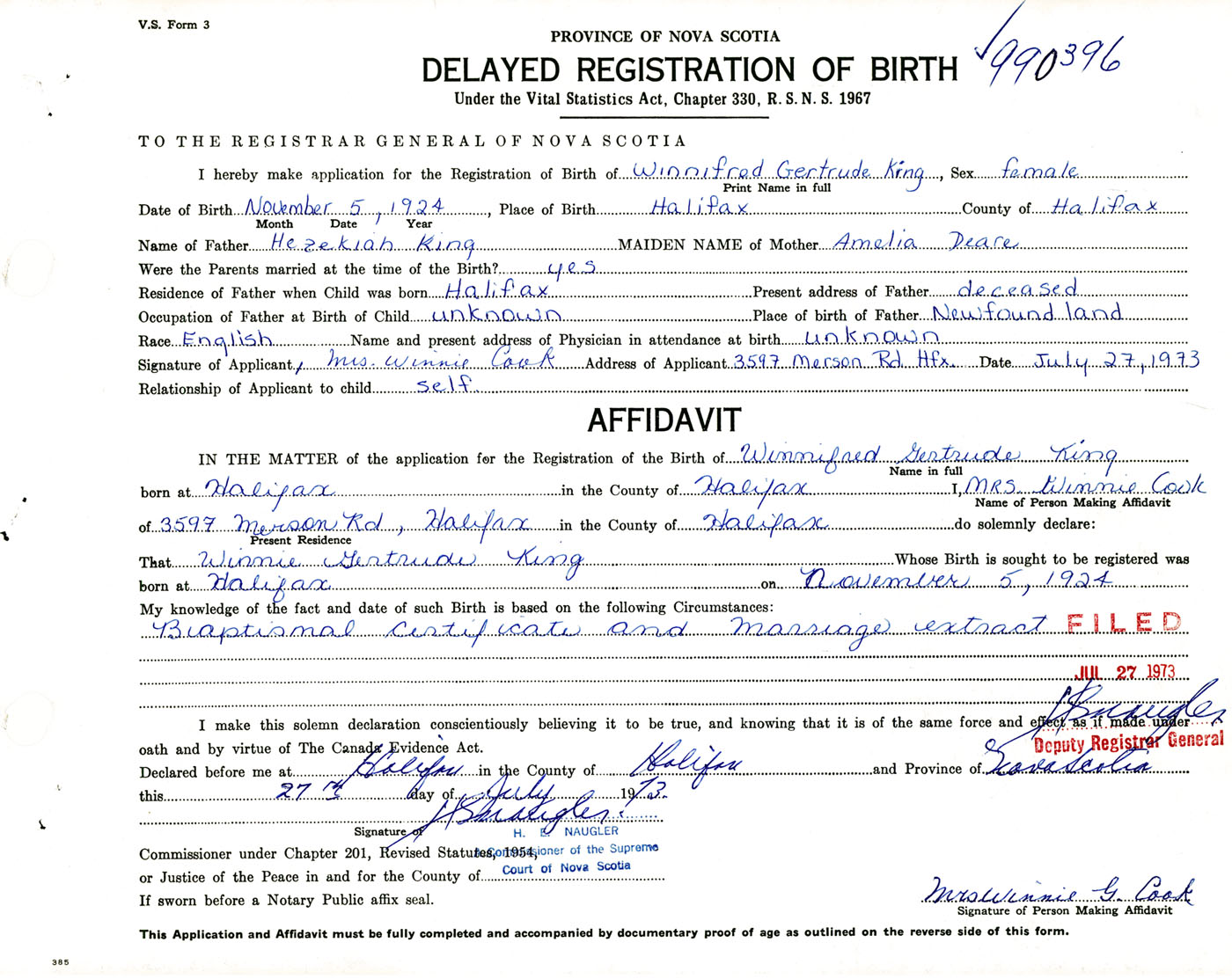 Signature of Applicant Mrs. Winnie Cook Address of Applicant 3597 Merson Road, Halifax, NS Date 27 July 1973