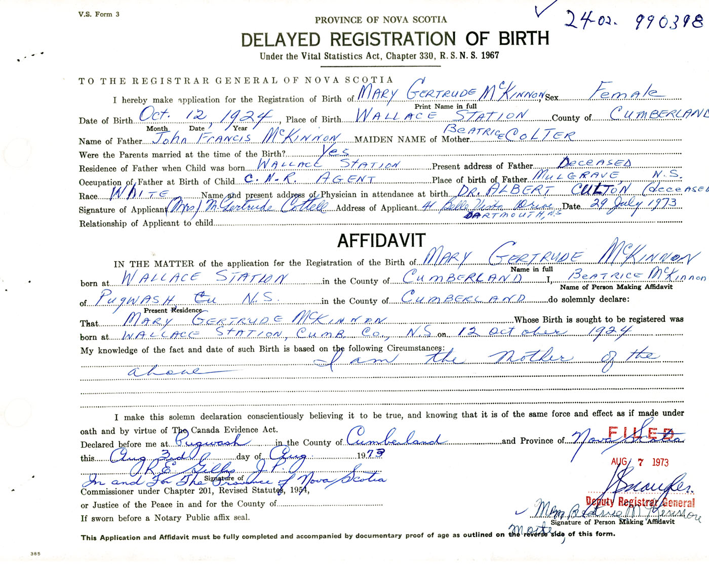Name of Father John Francis McKinnon MAIDEN NAME of Mother Beatreice Colter