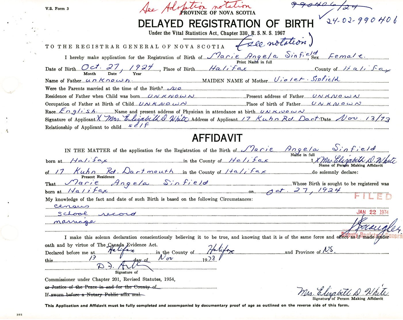 Signature of Applicant Mrs. Elizabeth D. White Address of Applicant 17 Kuhn Road, Dartmouth, NS Date 13 November 1973
