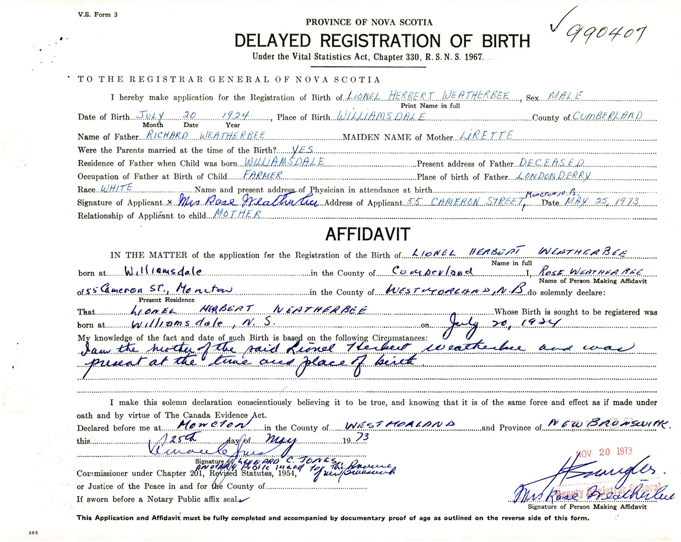 IN THE MATTER of the application for the Registration of the Birth of Lionel HerbertWeatherbee