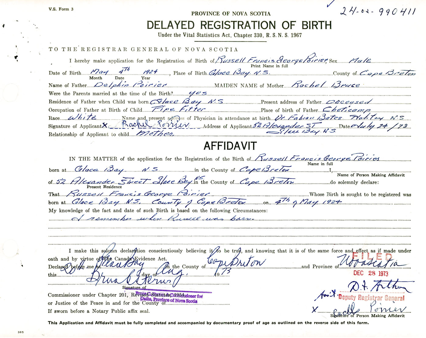 I hereby make application for the Registration of Birth of Russell Francis GeorgePoirier Sex Male