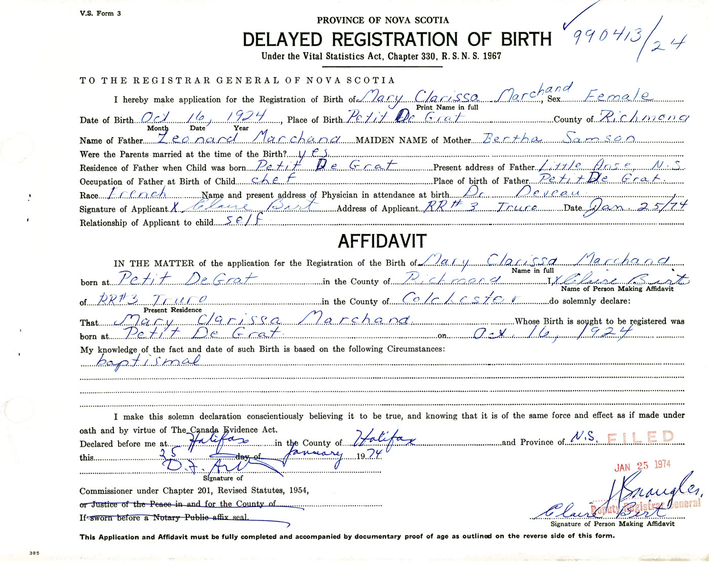 IN THE MATTER of the application for the Registration of the Birth of Mary ClarissaMarchand