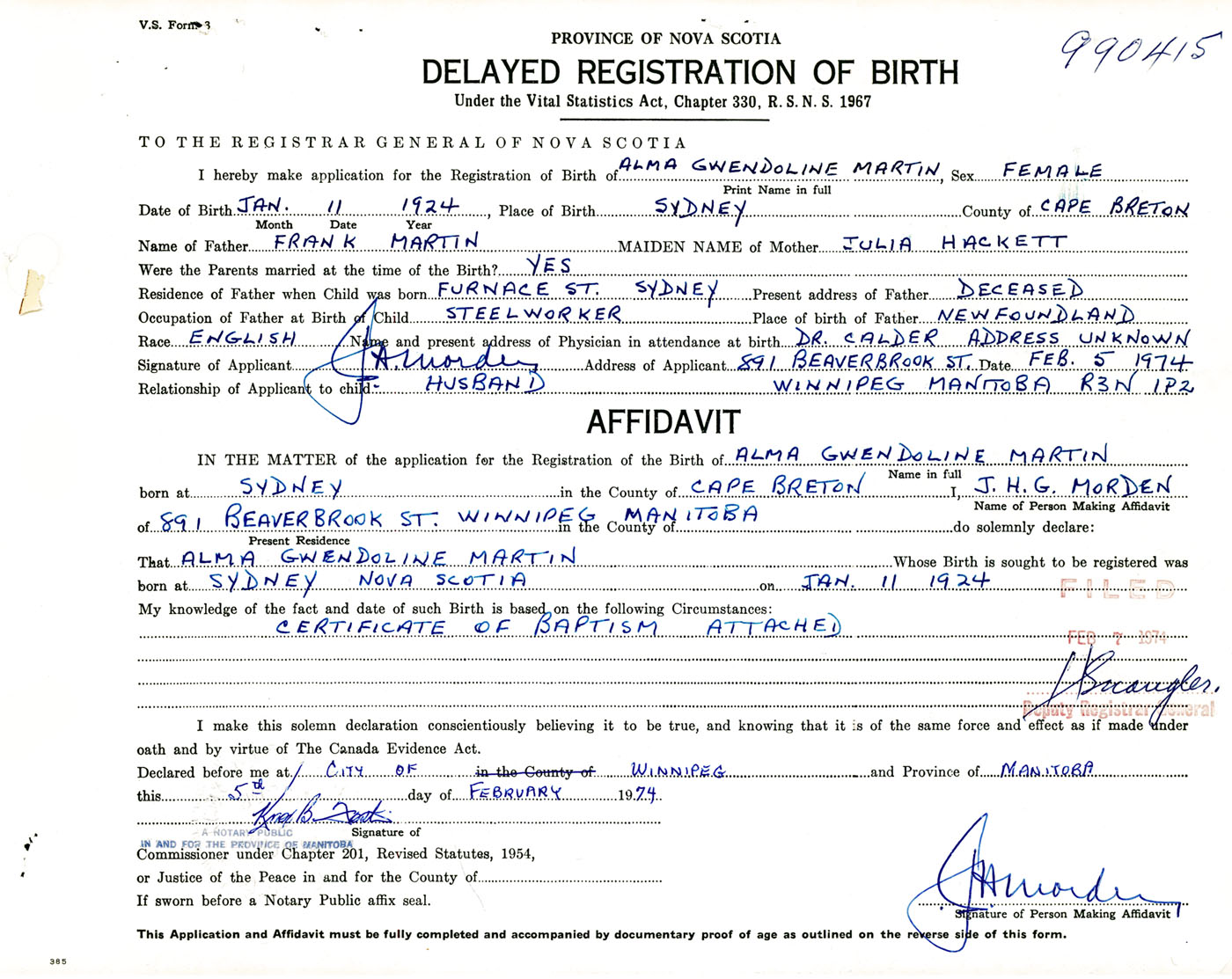 I hereby make application for the Registration of Birth of Alma GwendolineMartin Sex Female