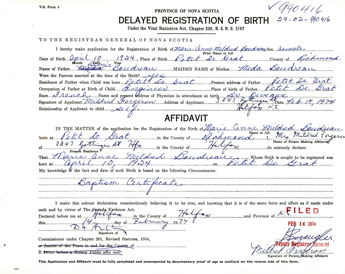 I hereby make application for the Registration of Birth of Marie Anne MildredBoudreau Sex Female