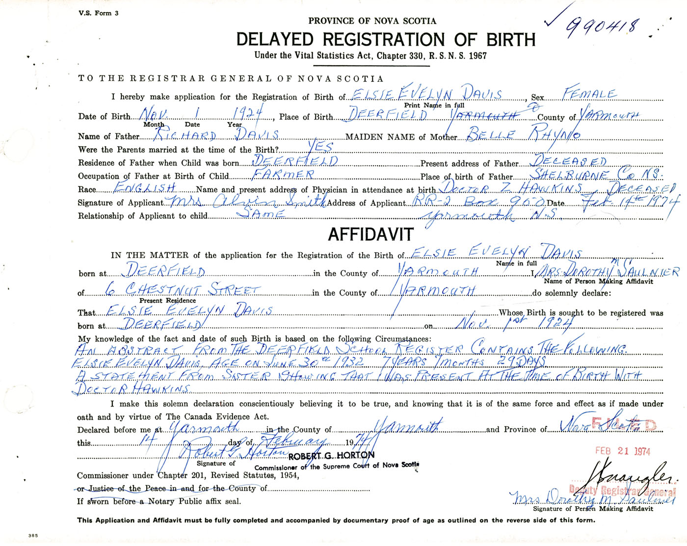 An abstract from the Deerfield School Register contains the following: Elsie Evelyn Davis, age on June 30th, 1932 was 7 years, 7 months and 29 days. A statement from sister showing that I was present at the time of birth with Doctor Hawkins - Mrs. Dorothy Saulnier