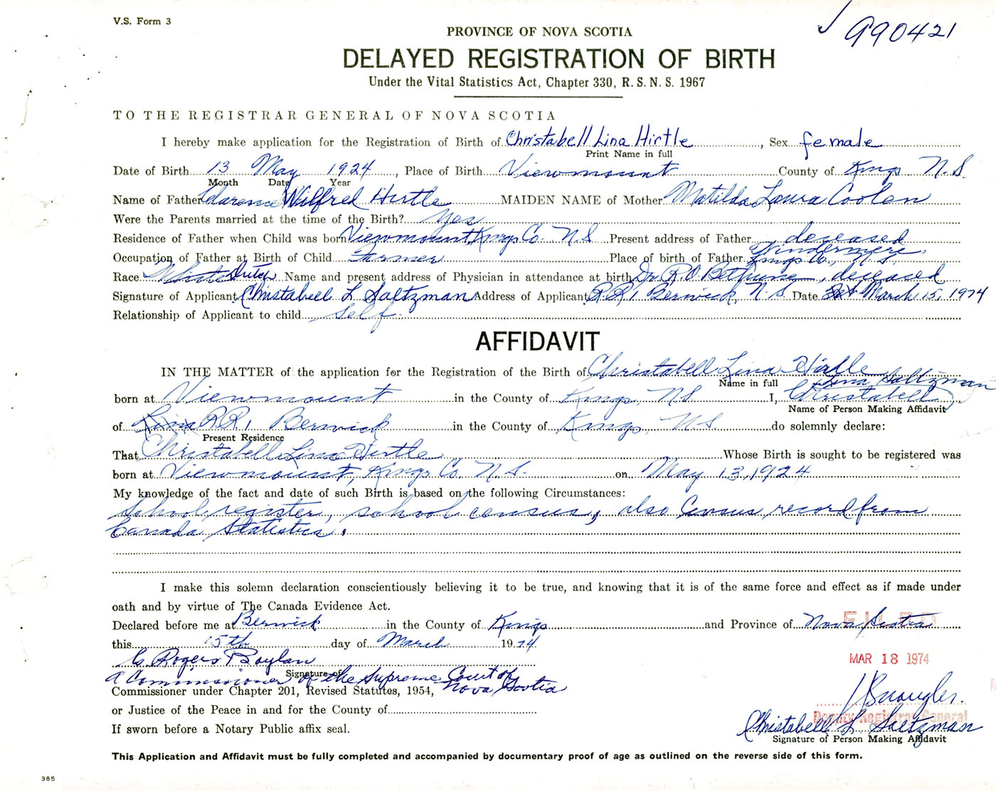 Signature of Applicant Christabell L. Saltzman Address of Applicant RR #1, Berwick, Kings Co., NS Date 15 March 1974