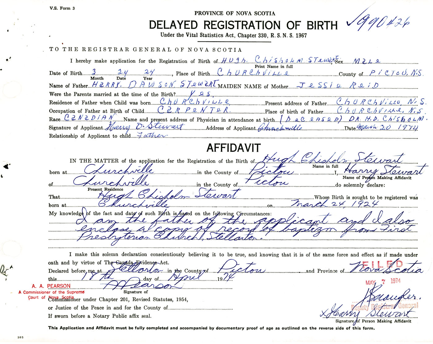 Signature of Applicant Harry D. Stewart Address of Applicant Churchville, Pictou Co., NS Date 20 March 1974