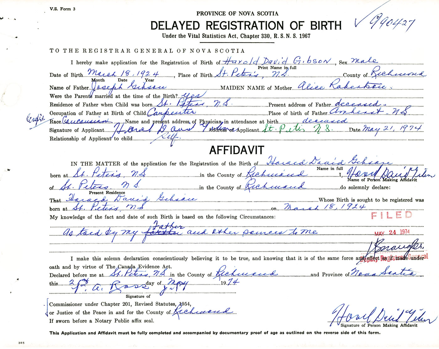 Signature of Applicant Harold David Gibson Address of Applicant St. Peters, Richmond Co., NS Date 21 May 1974