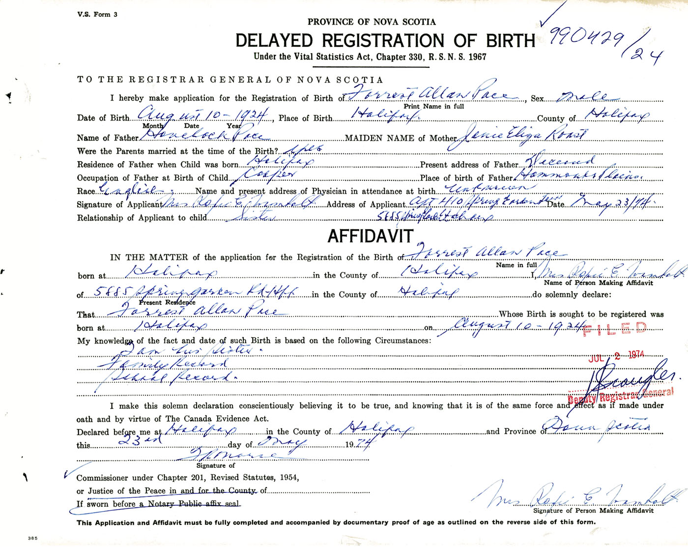 I hereby make application for the Registration of Birth of Forrest AllanPace Sex Male